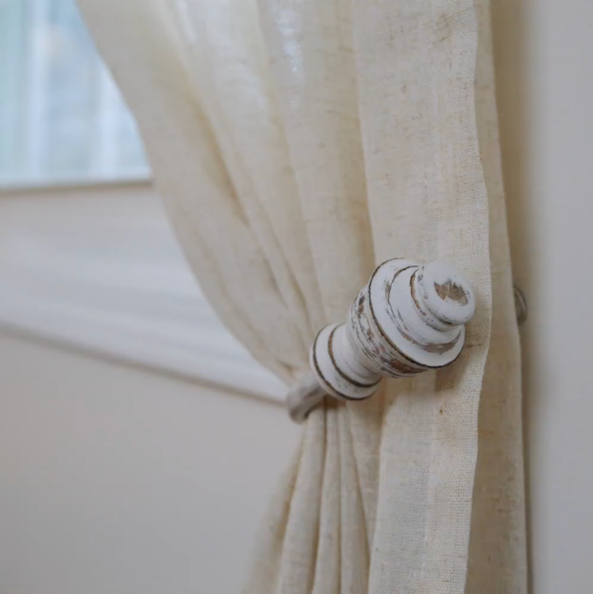 The Farmhouse Collection Distressed Ivory Window Curtain Holdbacks are a must-have for a rustic look or nautical-inspired spaces.