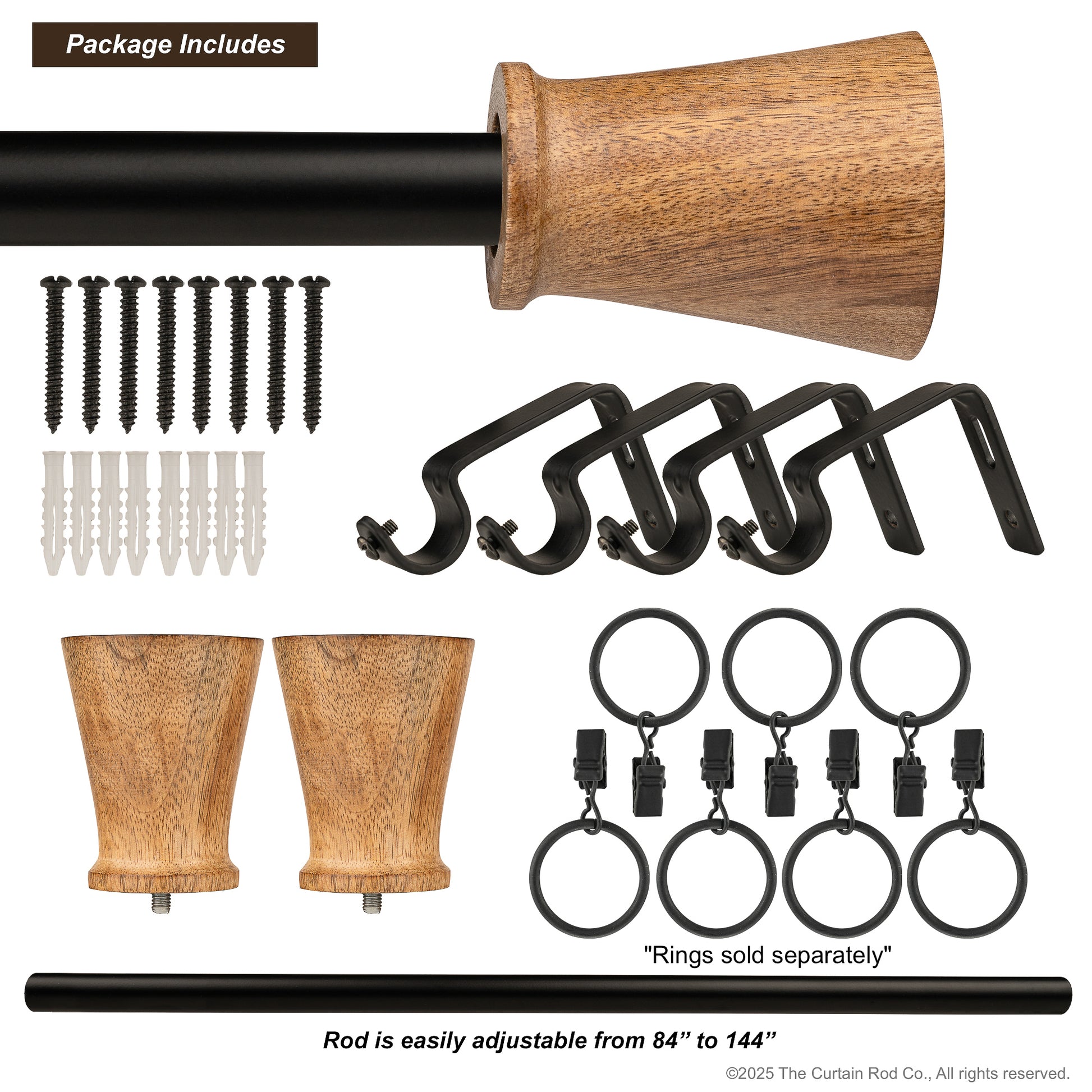 INCLUDED: Complete Curtain Rod Set, Set of Natural Wood Finials, Mounting Brackets and Hardware.